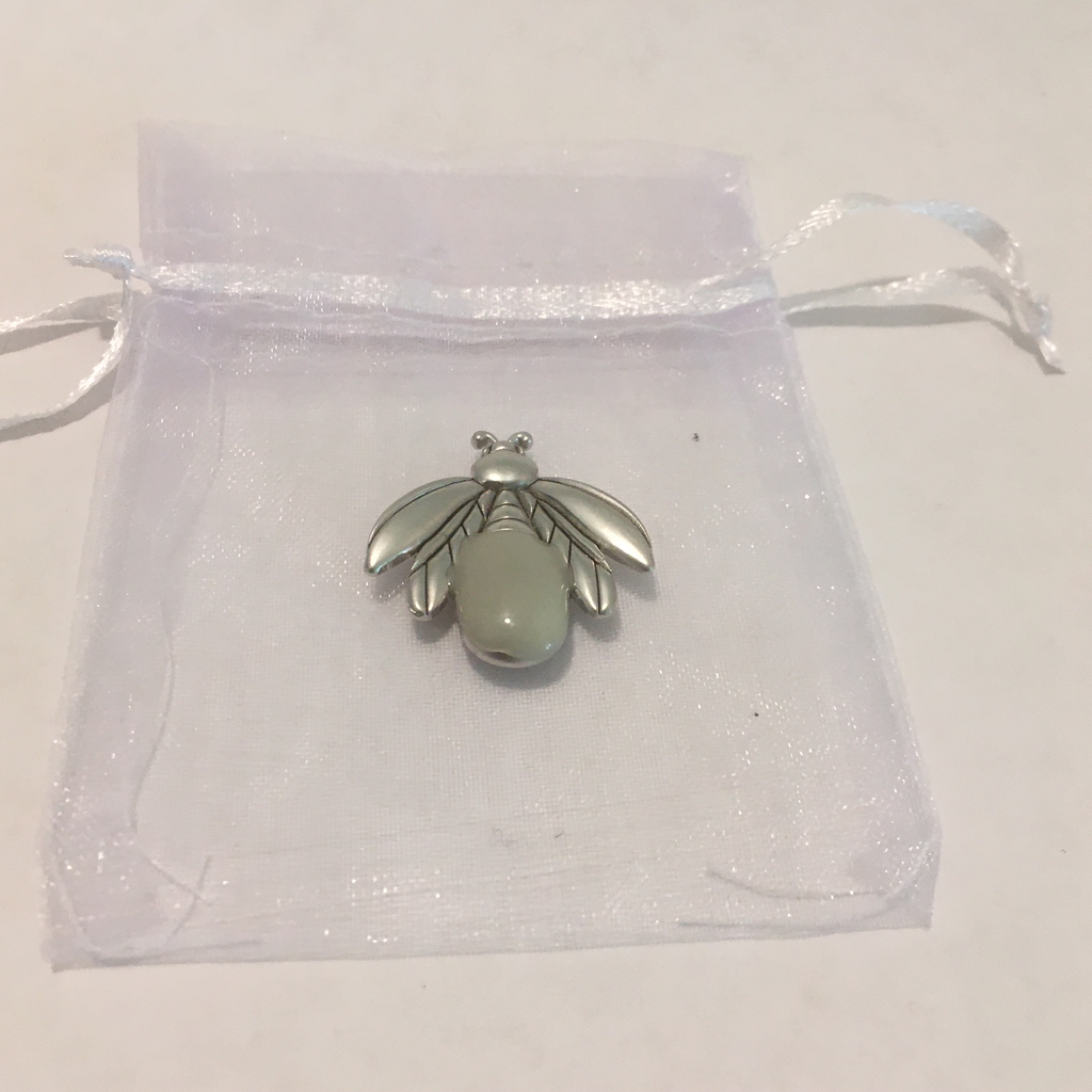 Fireflies or "lightening bugs" have an ethereal quality. Silently flittering about, blinking like beacons in the dark.... luminescence .... truly magical. This little metal token has been infused with an illuminating material (or is it magic???)