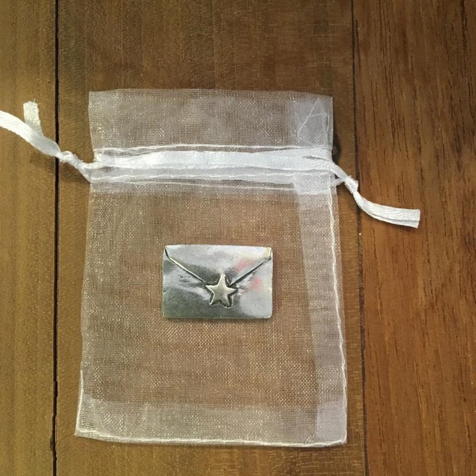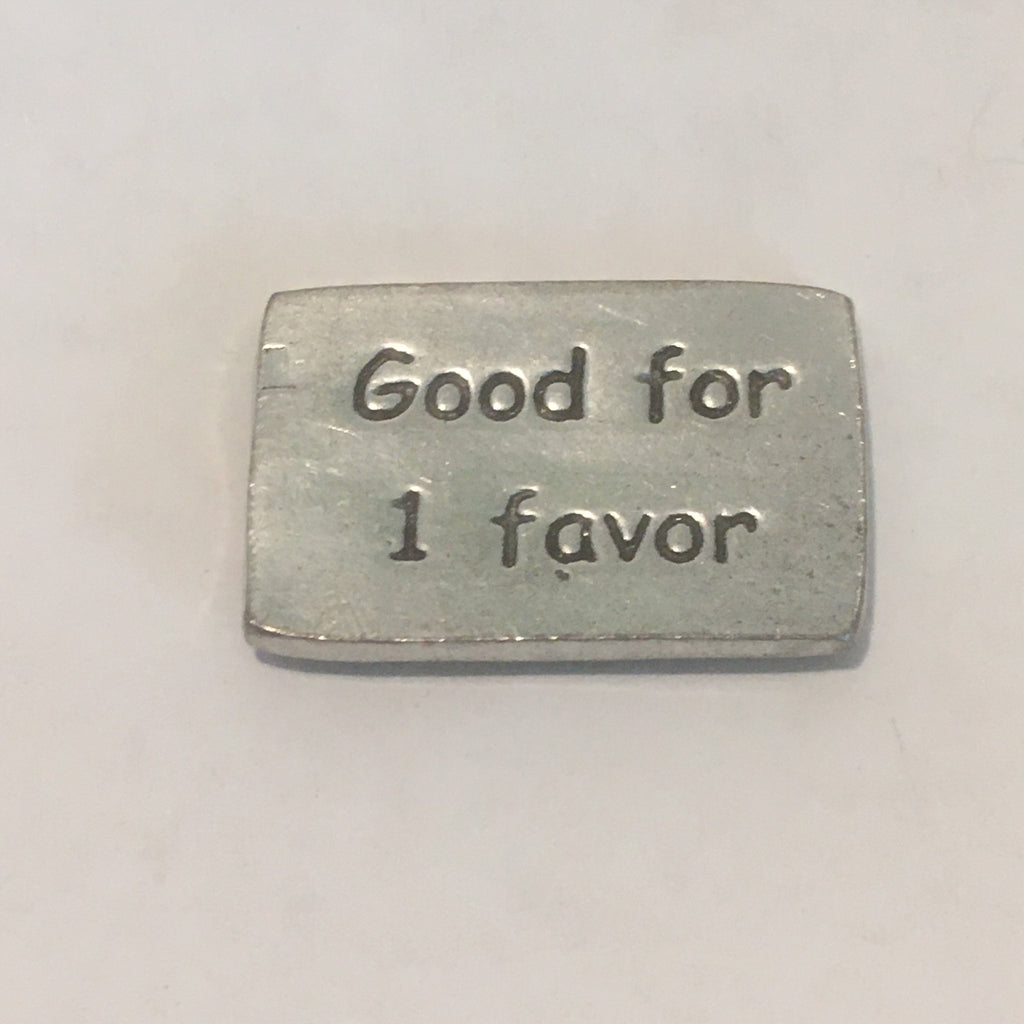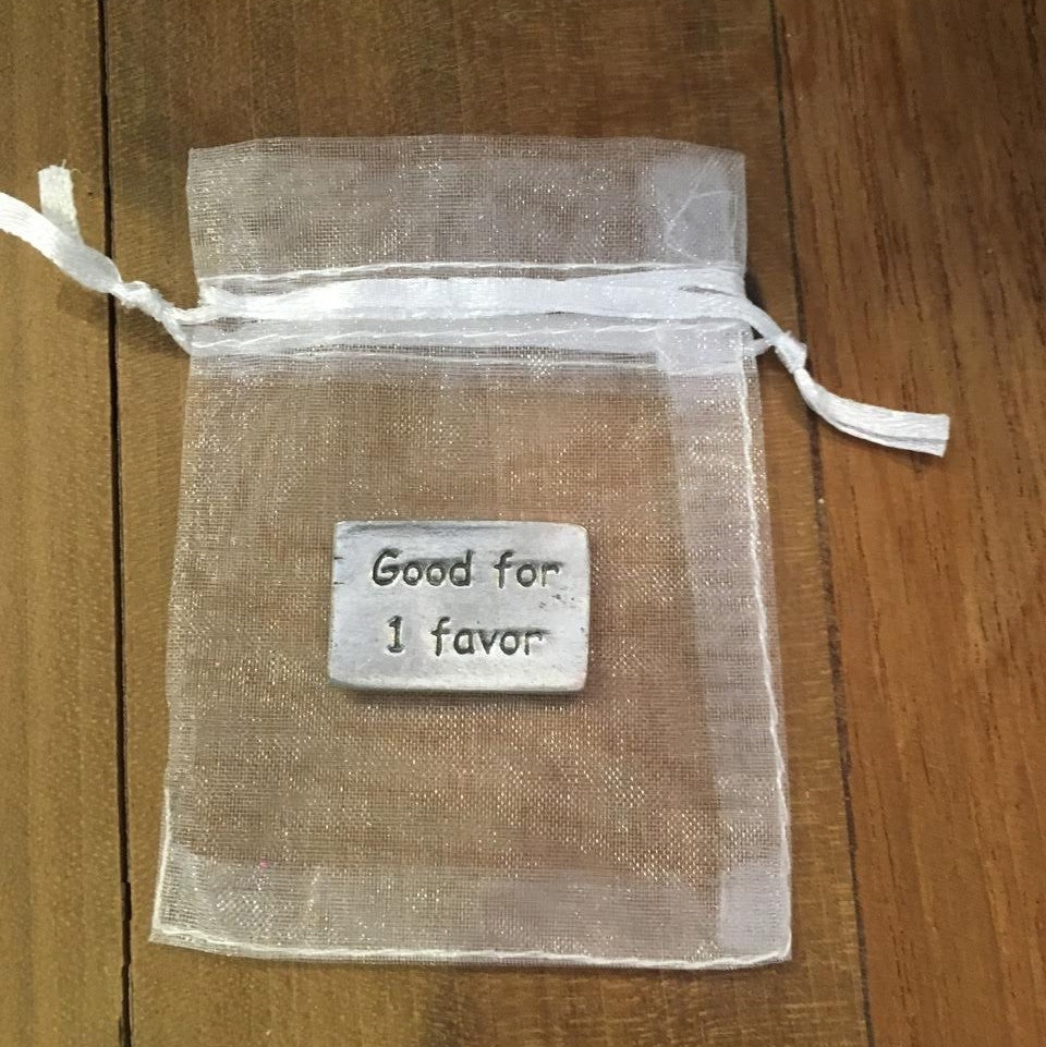 Our collection of tiny tokens are the perfect pocket keepsakes. Choose your token, choose your message and then pass it on to someone special. This token looks like an envelope sealed with a star on one side, the flip side reads "Good for 1 Favor". Sold Singly, in cloth drawstring gift bag.