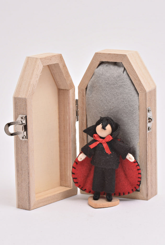Dracula Little comes from a long line of tomato-juice drinking Littles. (they need the extra vitamin C). He does keep up the tradition of sleeping in this comfy coffin, just for the fun of it. As he said, "some Littles sleep best in a hammock, others a bed, I love a good box with a lid”. Enjoy his night time companionship, or let him adorn your Halloween decor.