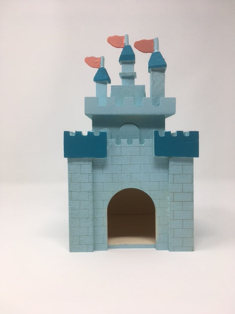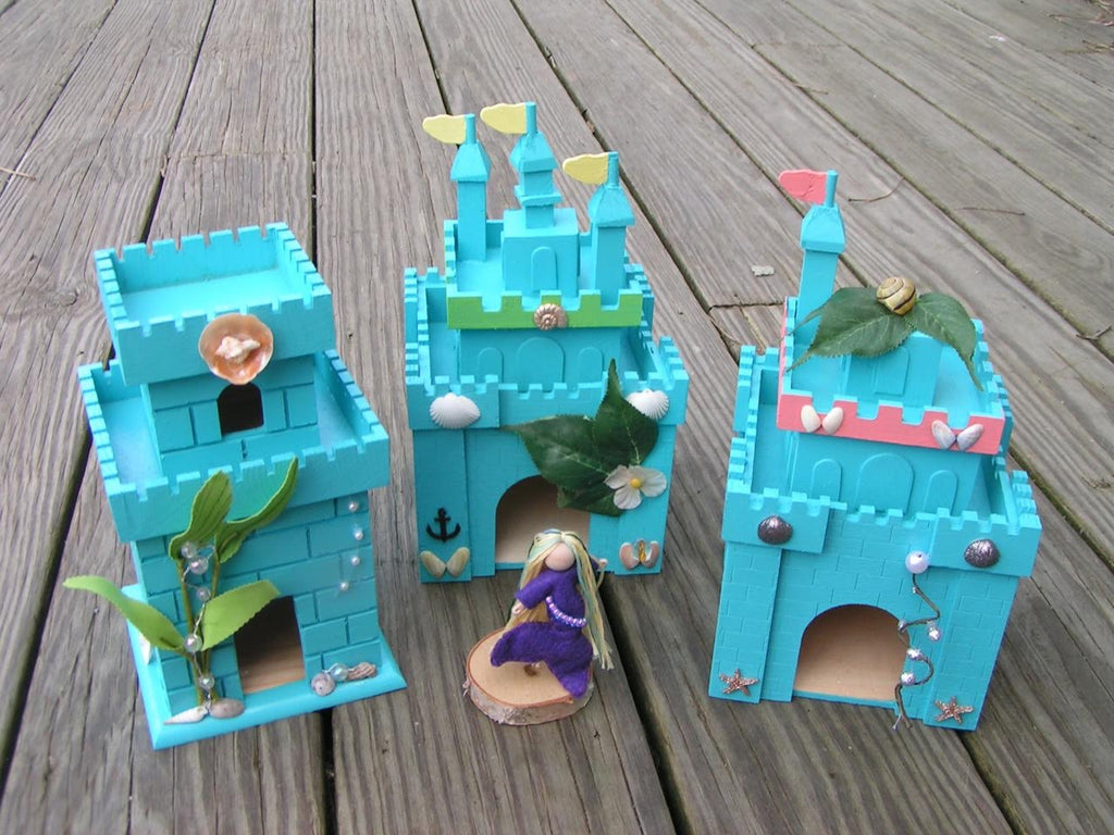 Rule the sea with this wooden castle. Artist crafted castles are each one-of-a-kind originals accented with bright paints, faux seaweeds, natural shells and gems. A mermaid completes the set, or order several to create an underworld community.