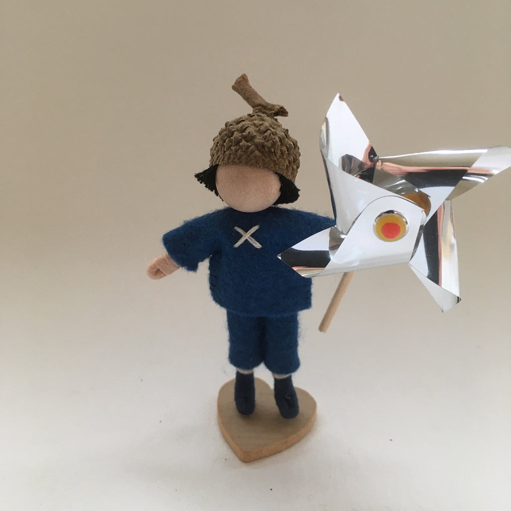 These Littles each come sporting a brightly colored outfit and holding a tiny working pinwheel. During the 19th century any wind-driven toy held aloft by a running child was characterized as a whirligig, including pinwheels. The joy continues!