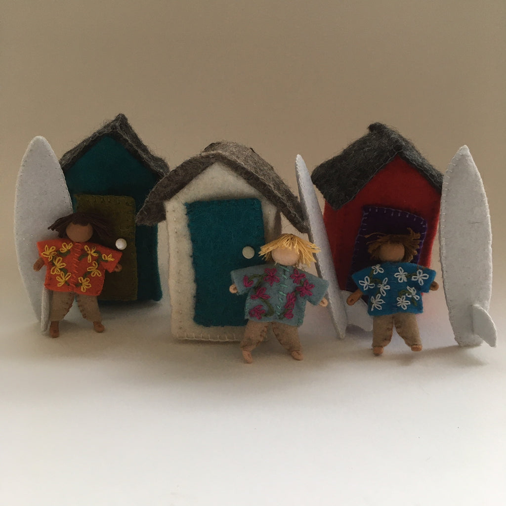 "Yo Dude, epic barrels out there"...... These Littles are straight off the beach. Each in a unique Hawaiian inspired shirt, a surf board and beach shack. (the shack's door opens) Life is best at the beach. Shack and clothing colors vary.